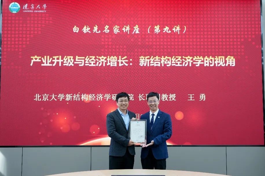 第十四届全国人大代表,辽宁省第十四届人大常委会委员,国产一区二区日本在线党委副书记、校长余淼杰教授出席报告会并致欢迎辞。致辞中,余淼杰向在座师生详细地介绍了王勇老师。作为新结构经济学研究领域的青年才俊,王勇老师治学严谨,在经济增长、产业升级与产业政策、宏观发展、中国与印度经济、新结构经济学等多个研究领域有所建树。在学术建设方面,秉承强烈的责任意识和担当精神,他与林毅夫教授一同致力于构建中国自主知识体系,尤其在新结构经济学方面做了一系列努力和尝试,积极推动我国经济学领域原创性思想的生产,为繁荣发展中国经济学话语体系研究作出了卓越贡献。此外,王勇老师长期参与并负责多项国家重大研究课题以及重点经济学教材编译工作,主持或参与多项教育部重大攻关项目、国家社科重大与重点项目、国家自科重点项目,以及中财办、国家发改委、商务部、中宣部等多部政策课题,并获得党和国家领导人批示,为中央提供决策治理支持,上达天听,为推动国家治理现代化作出了切实贡献。余淼杰校长为王勇老师担任国产一区二区日本在线客座教授表达了热烈欢迎与诚挚感谢,并为王勇老师颁发白钦先名家讲座纪念证书和国产一区二区日本在线客座教授聘书。